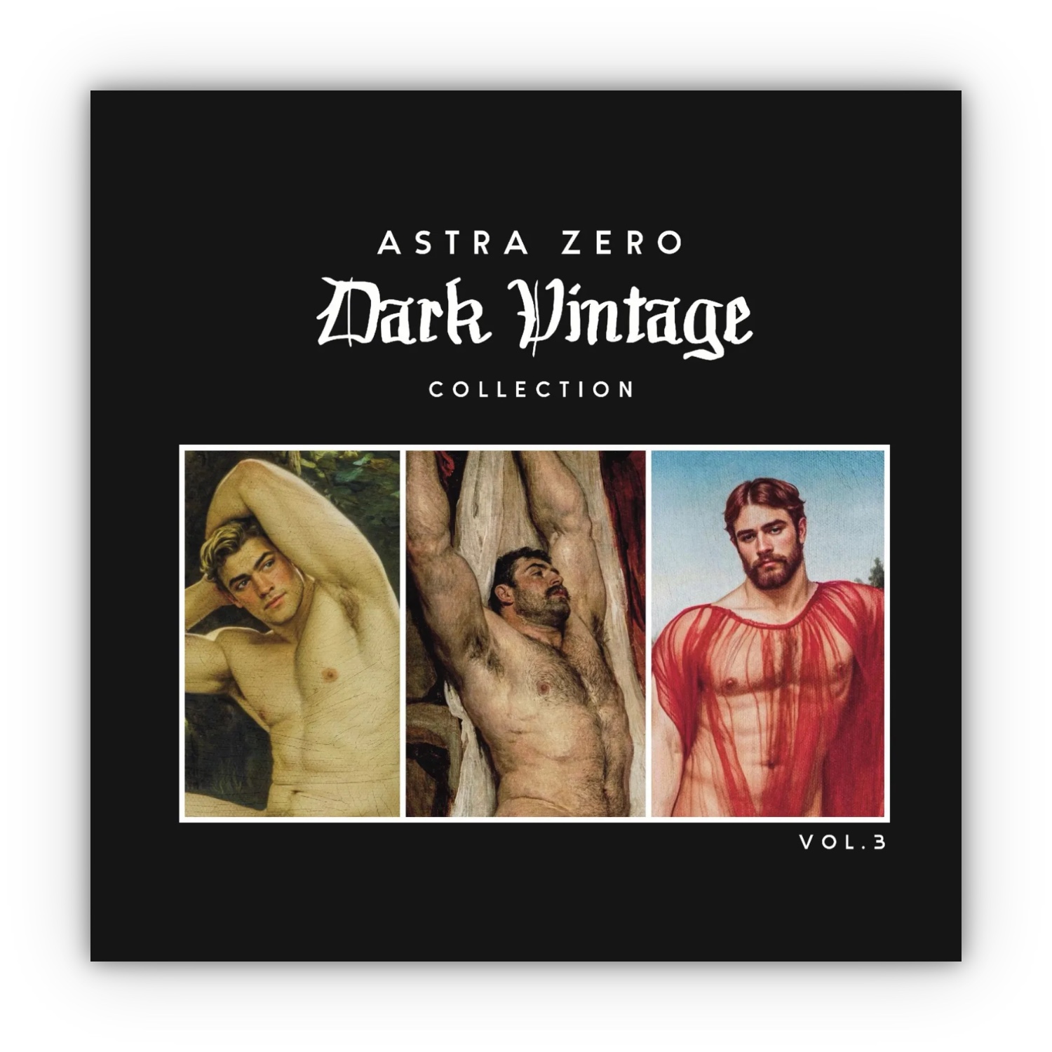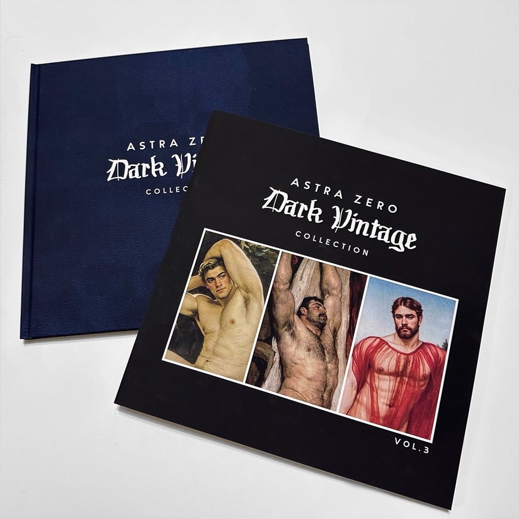 In the third volume of the Dark Vintage Collection, queer Canadian artist Astra Zero continues an ongoing exploration of historical imagery through a contemporary queer lens. This latest installment revisits classical and vintage visual traditions, reinterpreting them with an uncompromising focus on the male form, gothic sensuality, and restrained decadence.